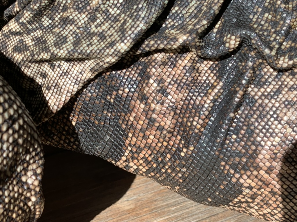 A friend took me to a rattlesnake den where I saw my first timber rattler in the wild. He was coiled, his scales a mosaic of brown ones against ochre yellow, his body and head absolutely sculptural and his eyes were gold with vertical pupils.