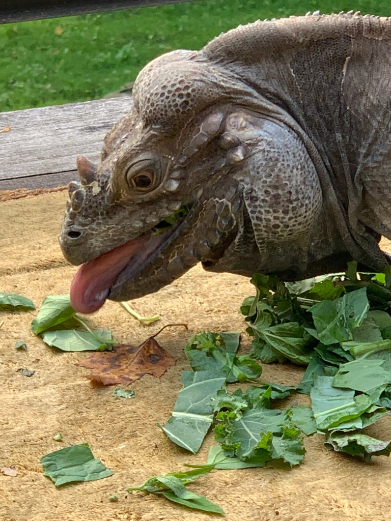 As spring turned to summer, I learned to identify many wild plants growing in the yard and field that were safe and nutritious for iguanas to eat. Also, I planted nasturtium, arugula, and turnip seeds, and bought collard greens and blueberries at the farmer’s market. I made salads for the iguanas that included at least five different kinds of greens and weeds, and flowers like violets and wild roses and nasturtiums. While blueberries were in season, the lizards ate them every day.