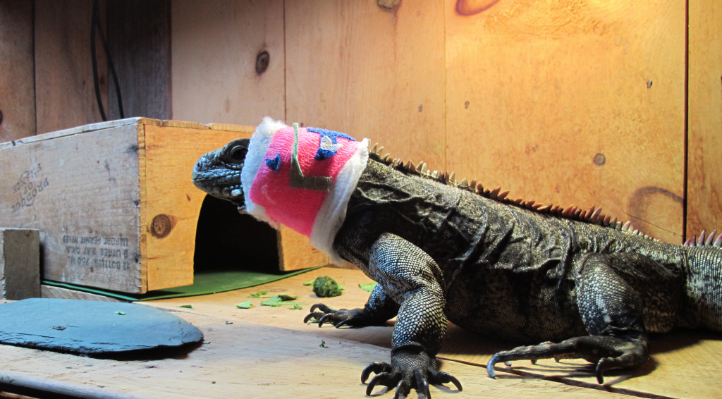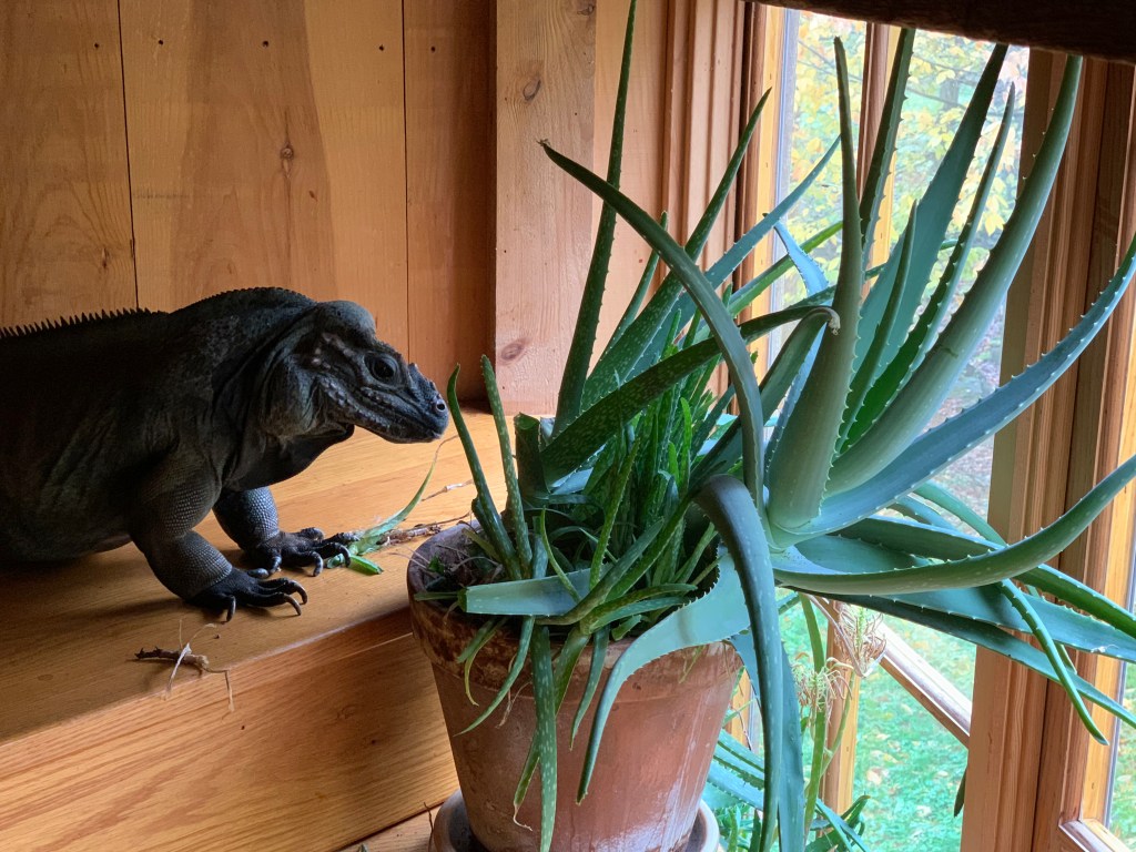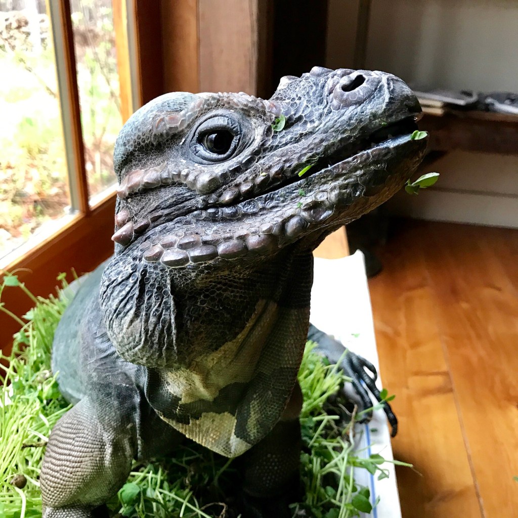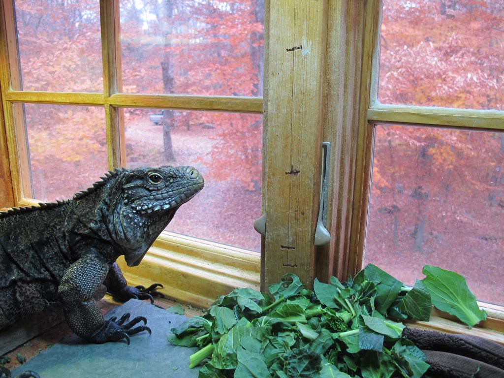 Iguanas have social and biological drives, and they need to come out of their enclosure every day for runabouts, to keep their digestion healthy and to alleviate boredom. In Temple Grandin’s book ANIMALS MAKE US HUMAN, she talks about what captive animals need to be happy. The same things, mostly, are true for iguanas. Grandin says, “…the more freedom you give an animal to act naturally the better, because normal behaviors evolved to satisfy core emotions…if you can’t give an animal the freedom to act naturally, then you should think about how to satisfy the emotion that motivates the behavior by giving the animal other things to do.”