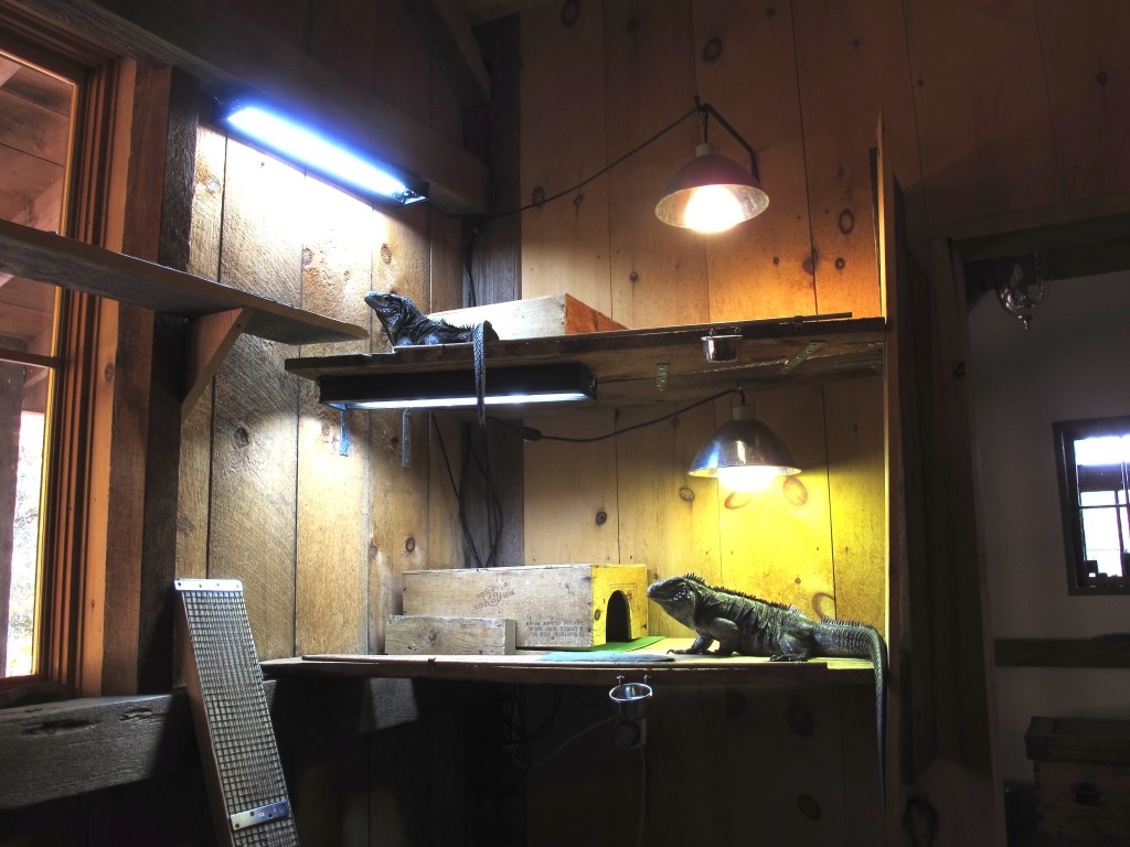 If they can’t go outside, the iguanas take turns roaming and SEEKING upstairs and down. The barn’s heat system is radiant, and the floors are warm.