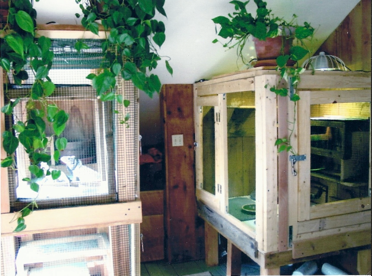 The barn faces south-east and there are sunning cages outside. On the upper deck are 6 x 10 dog kennels for the rhinos. Che and Luna have smaller cages on the lower deck. By mid-February, we’ll start getting sunny days –no clouds, no wind—and the lizards can go out on the decks for an hour. By April they can be out almost all day and I put up shade tarps, so they don’t overheat. When Che and Luna are in their sunning cages, they bob heads at each other and make faces.