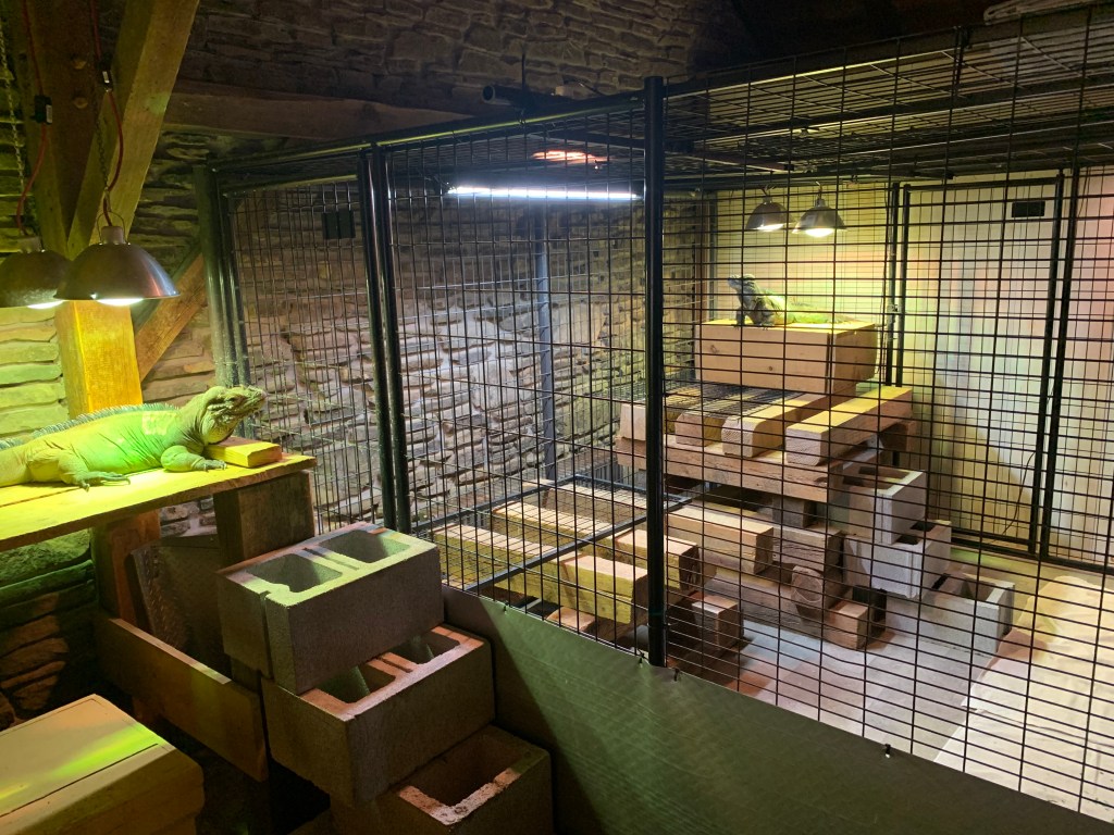Emo’s corral is built around one of the barn window dormers and looking at the photo, it is to the left, behind the camera. Emo can sit on his basking place and see Ava and Sebastian, and he can see into the woods.