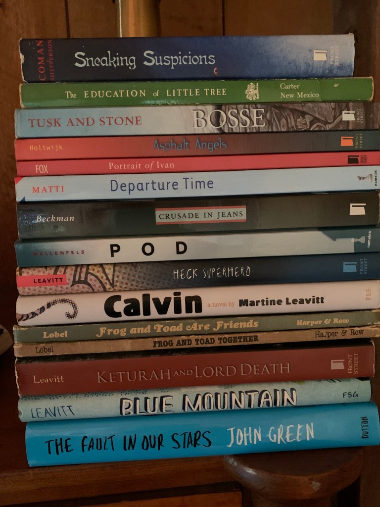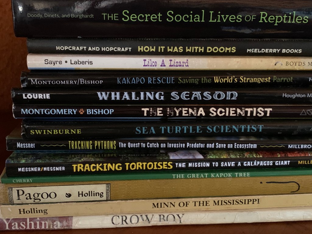 Here are stacks of books I love. So many are missing! Like memoirs by Janisse Ray, Linda Hogan, Joy Harjo, and J. Drew Lanham. They are on my Kindle.