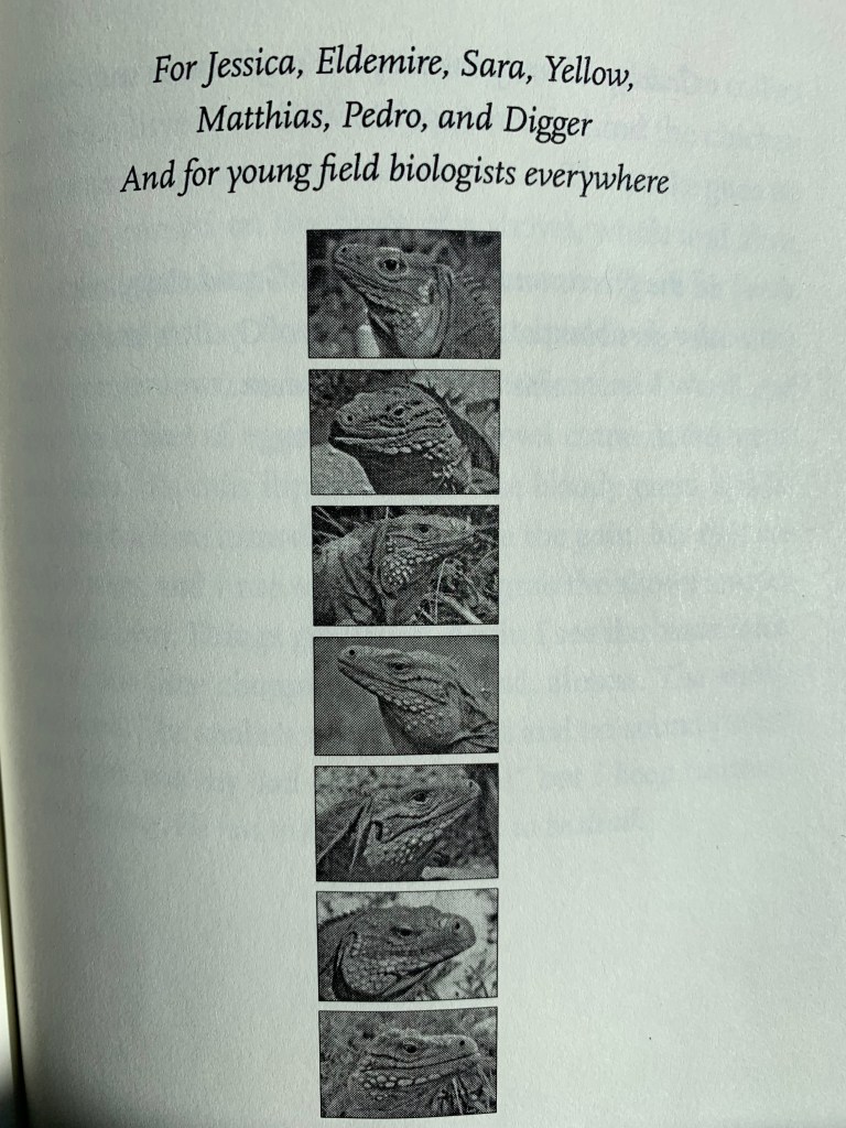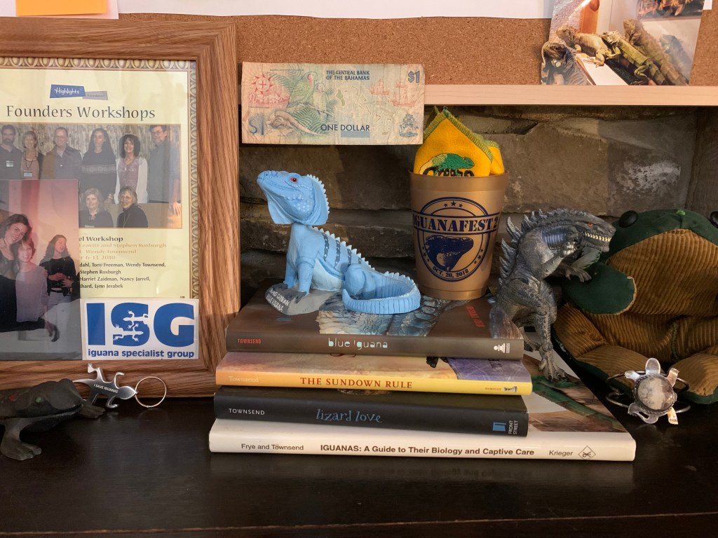 Jill Jolay won King Blue for me in an auction, as a gift to acknowledge the book he’s sitting on, Blue Iguana. Jill travels to Caribbean islands to work with the scientists who are saving critically endangered rock iguanas.